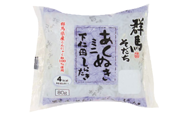HOME商品紹介蒟蒻あくぬきミニしらたき 蒟蒻 あくぬきミニしらたき 小パック形態で、小家族や、少しだけ料理に使いたいときに便利です。あくぬき済みで、水洗いだけでご使用できます。 規格:80g保存方法:冷暗所(2℃〜25℃) 蒟蒻 栄養成分表示(100g当たり) エネルギー7kcalたんぱく質0.1g脂質0.2g炭水化物2.2g食塩相当量0g アレルギー関連 なし