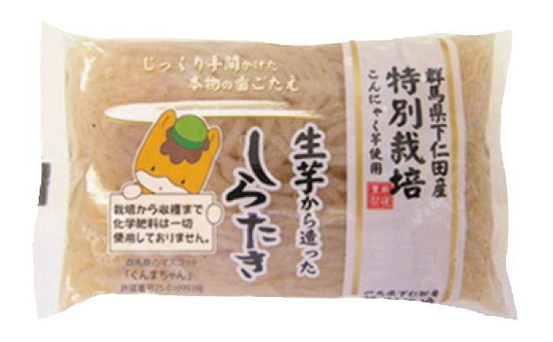 HOME商品紹介蒟蒻特別栽培生芋しらたき 蒟蒻 特別栽培生芋しらたき 特別栽培農産物の群馬県下仁田蒟蒻生芋を100%使用しています。味しみが良く、生芋蒟蒻独特の食感、風味が生きています。 規格:180g保存方法:冷暗所(2℃〜25℃) 蒟蒻 栄養成分表示(100g当たり) エネルギー5kcalたんぱく質0.1g脂質0.1g炭水化物2.4g食塩相当量0g アレルギー関連 なし