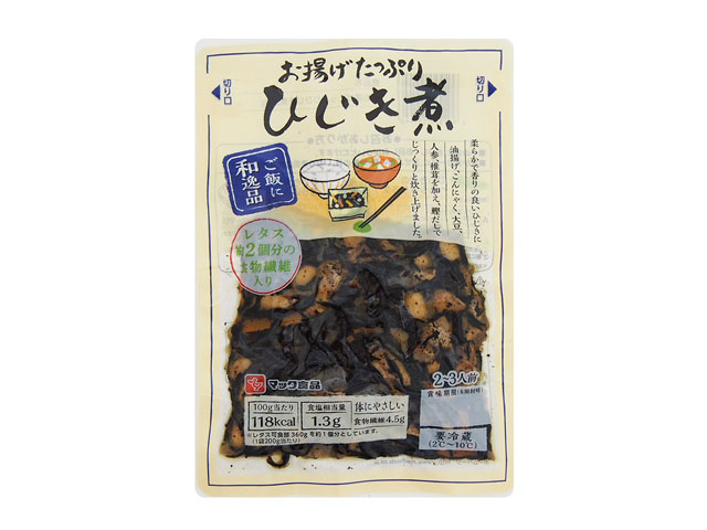 そのまま盛り付けるだけで、おつまみ又はおかずの一品になります。柔らかで香りのよいひじきに油揚げ、こんにゃく、大豆、人参、椎茸を加え、鰹だしでじっくりと炊き上げました。