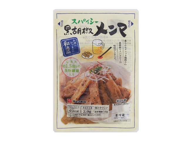 HOME商品紹介和惣菜スパイシー黒胡椒メンマ 和惣菜 スパイシー黒胡椒メンマ そのまま盛り付けるだけで、おつまみ又はおかずの一品になります。柔らかなメンマを粗挽き黒胡椒でスパイシーに味付けました。 規格:225g保存方法:要冷蔵(2℃〜10℃) 和惣菜 栄養成分表示(100g当たり) エネルギー45kcalたんぱく質2.5g脂質1g炭水化物8.2g食塩相当量2.9g アレルギー関連 小麦、大豆、鶏肉