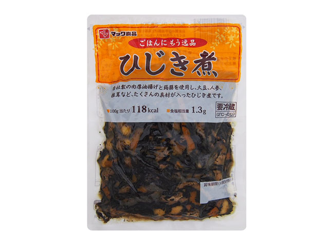 HOME商品紹介和惣菜ひじき煮 和惣菜 ひじき煮 自家製の肉厚油揚げと、蒟蒻を使用し、大豆、人参、椎茸など、たくさんの具材が入ったひじき煮です。 規格:300g保存方法:要冷蔵(2℃〜10℃) 和惣菜 栄養成分表示(100g当たり) エネルギー118kcalたんぱく質4.9g脂質7.5g炭水化物9.9g食塩相当量1.3g アレルギー関連 小麦、大豆