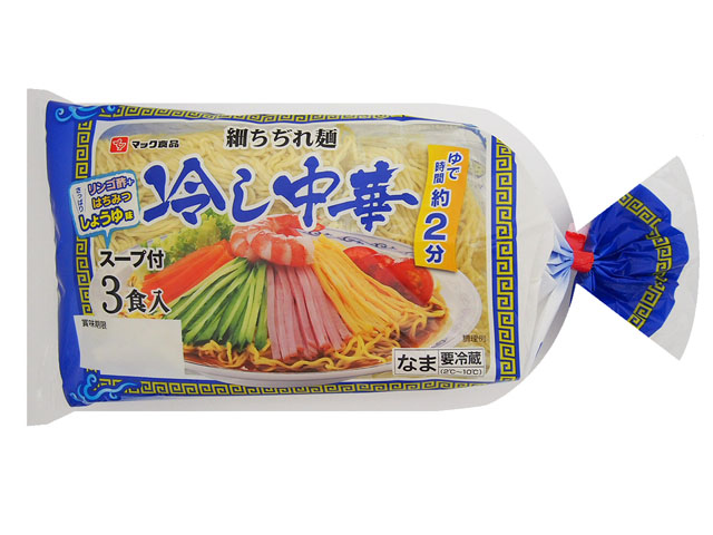 夏のメイン商品として定番の3食冷やし中華。多加水製法により、つるみ、弾力のある麺です。醤油感とごま油の風味をきかせ、すっきりとしたスープに仕上げました。