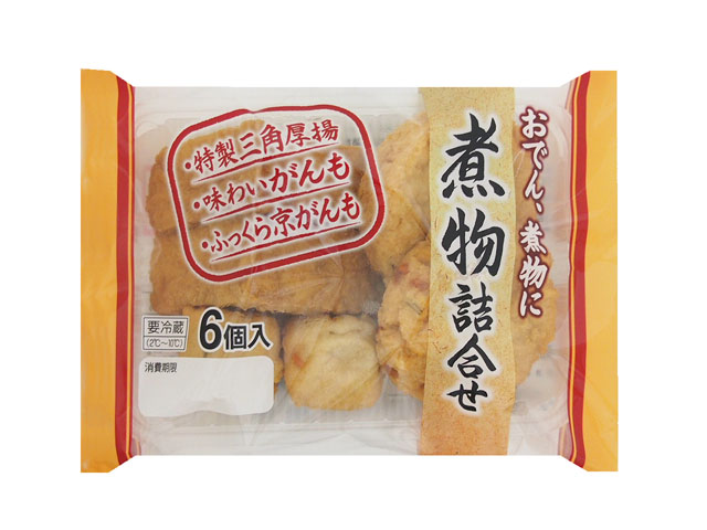 ソフトな食感の特製三角厚揚げ、味わい深い中判サイズのがんも、味染みの良い小ぶりなふっくら京がんもを2個ずつ、6個セットにした、煮物やおでんに便利な商品です。