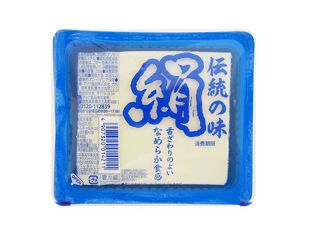 HOME商品紹介豆腐・揚げなめらか食感絹 豆腐・揚げ なめらか食感絹 にがり100%を使用した大豆のほのかな甘味と滑らかな舌触りの絹とうふです。冷奴、味噌汁など色々な料理に最適です。 規格:400g保存方法:要冷蔵(2℃〜10℃) 豆腐・揚げ 栄養成分表示(100g当たり) エネルギー60kcalたんぱく質4.5g脂質4.2g炭水化物1g食塩相当量0g アレルギー関連 大豆