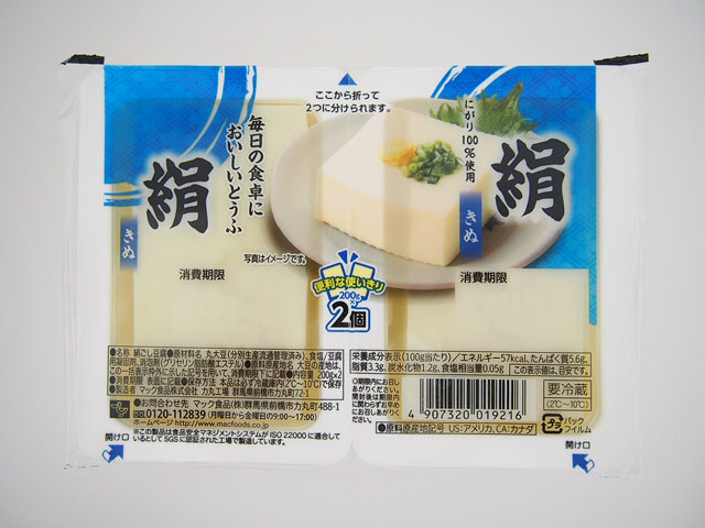 便利な使い切りサイズの2個パックです。にがり100%を使用し、大豆の甘みとコクを引き出しました。滑らかな食感の絹豆腐です。