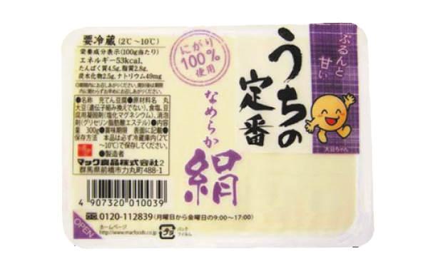 なめらかな舌ざわりの良い、やさしい口当たりで、家族みんなで毎日食べても飽きのこない美味しい充てん絹とうふです。にがり100%を使用し、大豆本来の風味と甘み・旨味を引き出しました。