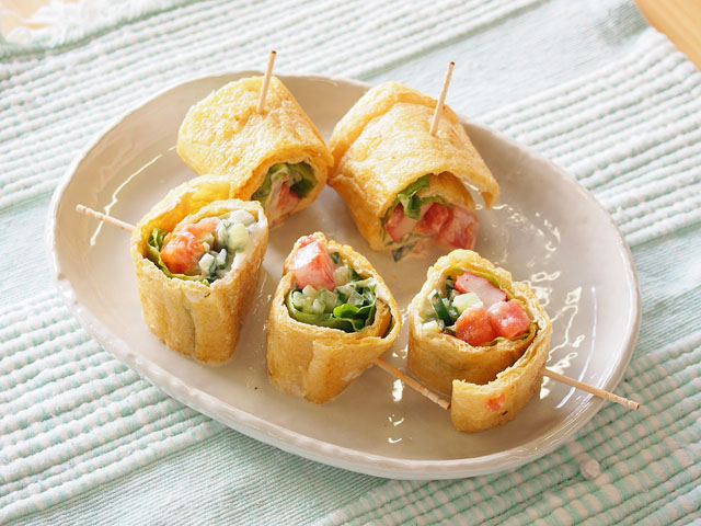- 油揚げにレタスをしき、キュウリ・マヨネーズ・カニかま・トマトをのせ、巻いて爪楊枝を等間隔に刺し固定する。